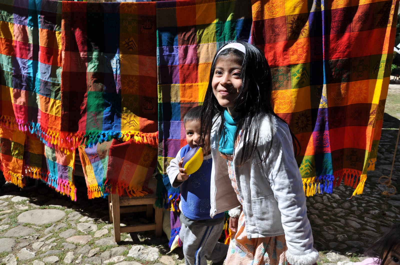 Two children at a Mexican open market after having been given two small gifts (a ball and a pen).