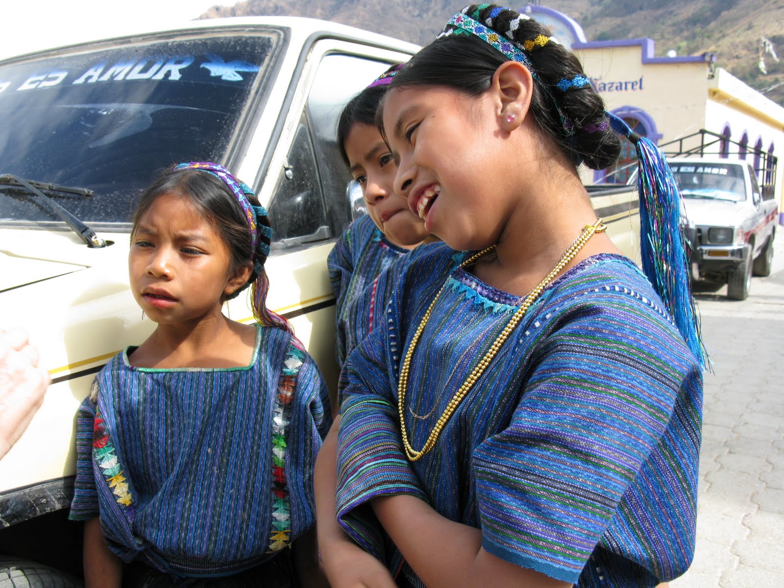 Three young villagers of San Palopo, Guatemala, while looking at some colouring pencils and pens I had brought for them.