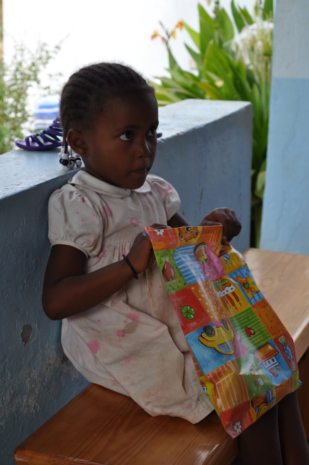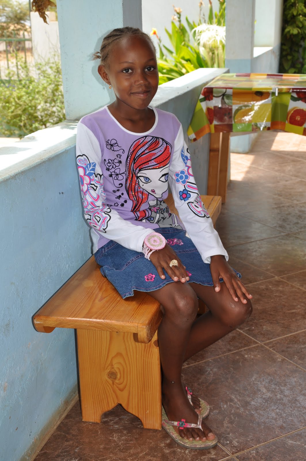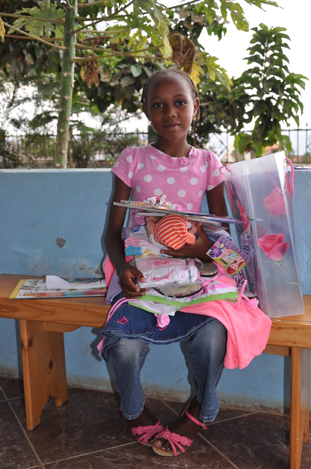 Leinira wearing one of the outfits and sandals I bought for her (Left). Leinira wearing one of the outfits I bought for her (Right).Note: The money I was given by Luisa was used for an outfit for Tarine; the money given by João was used to buy a doll for Nessinha; the money given by Manuela was equally divided to reinforce the existing amount for Simone, Neuza and Justina; the school material provided by Carla was given to Tarine and the money given to Leinida, who has become her protégée. The money given by Isabel was used for the birthday party (having Sibylle proovided the rest). The whole amount of money collected by the "godmothers" has been given to Sibylle to pay for the school fees and whatever may be necessary for the girls.