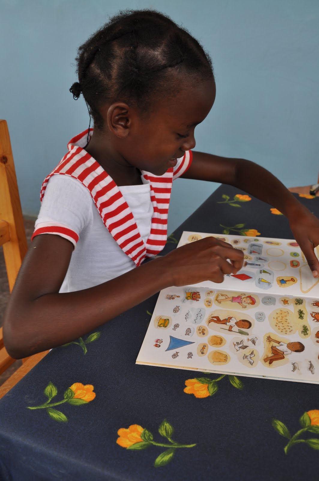 Tarine sellecting the correct stickers to complete the book I bought for her (Left). Tarine showing two pages of the book completed (Right).