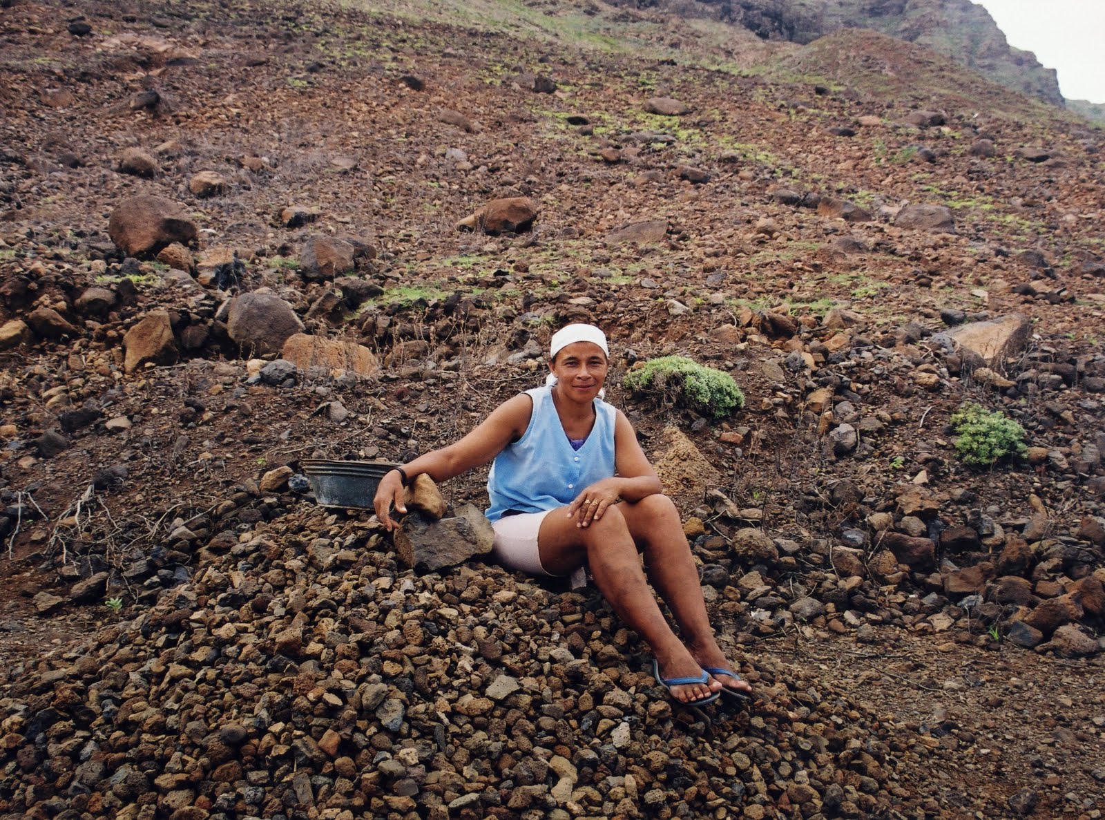 Ponta do Sol village (Left). Fontainhas village (Right).On the way to Coculi I met this lady, one of the many who work for endless hours collecting stones and transporting them across some difficult track towards a delimited area in the valley, where they have to break them smaller and have them filtered, so as to obtain a thin mixture similar to sand, used for construction purposes. I was impressed with the amount of hard work involved, but even more impressed when she (another Capeverdean mother bringing up their children alone) invited me to the house she had built herself with the help of her two daughters and son (still young adolescents).
