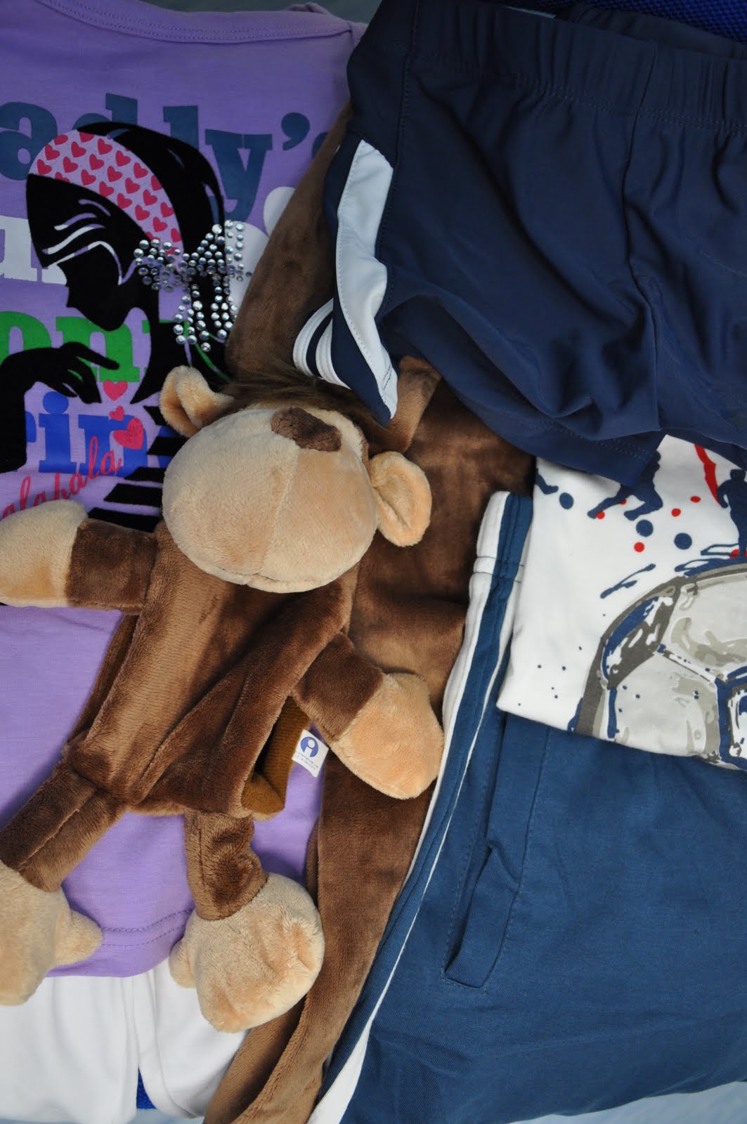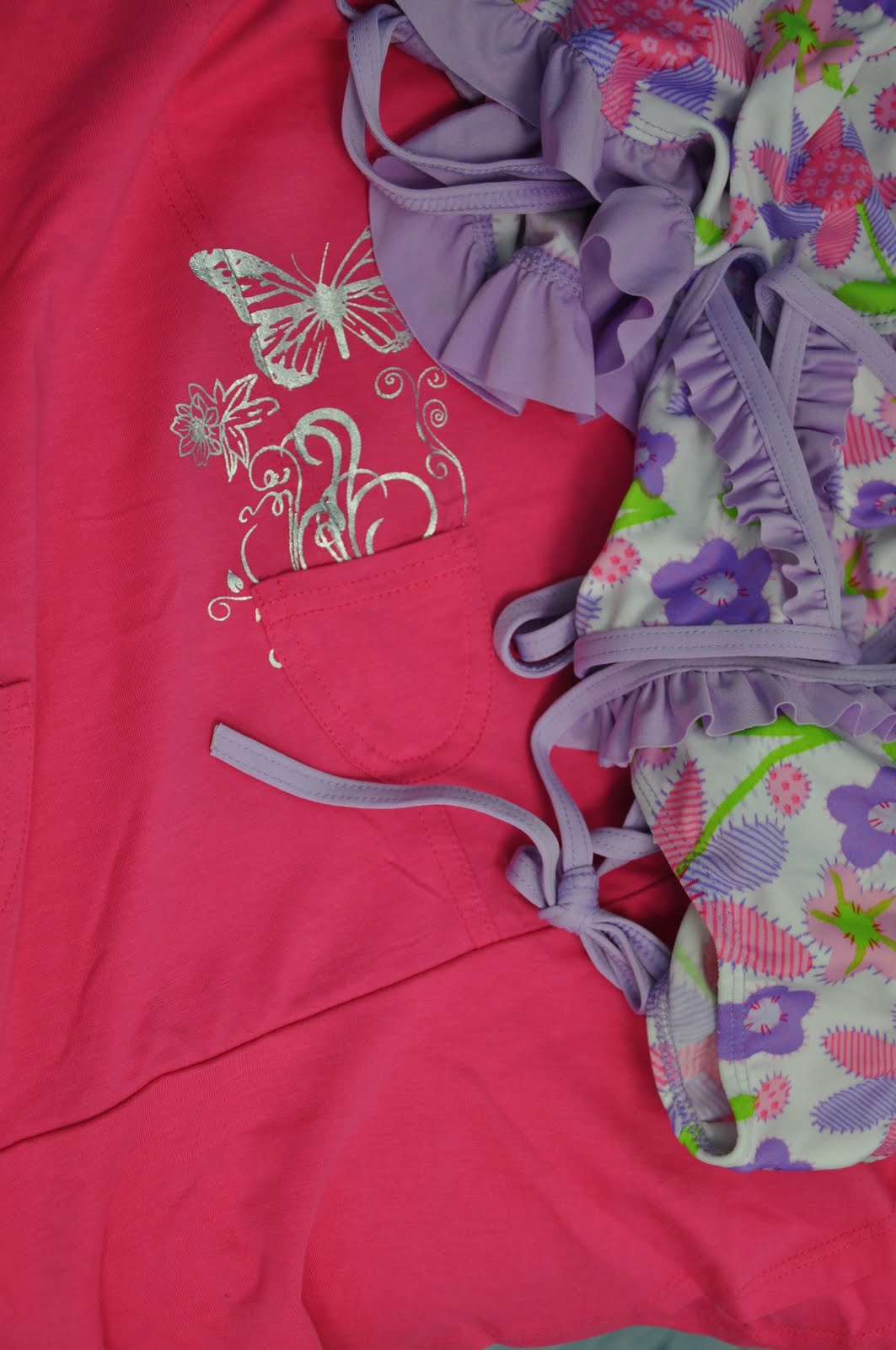 A violet T-shirt, some white pants and a brown monkey scarf I have bought for Leinira together with a blue and whiteT-shirt, some blue shorts and swim shorts I have bought for Eduardo (Left). A pink dress Paula has bought for Ivanilda and a three piece bathing suit I have bought for her (Right).