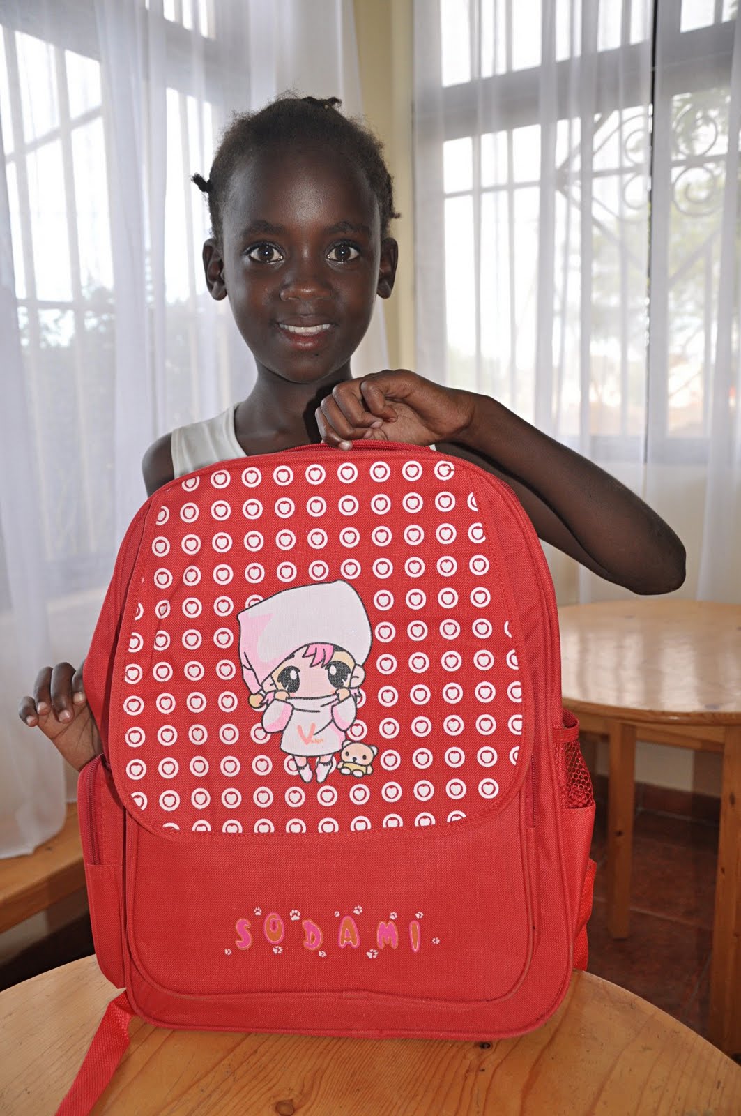 Tarine showing her new school bag (Left)Tarine, Simone, Ivanilda and Leinira proudly doing the same (Right).