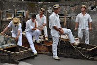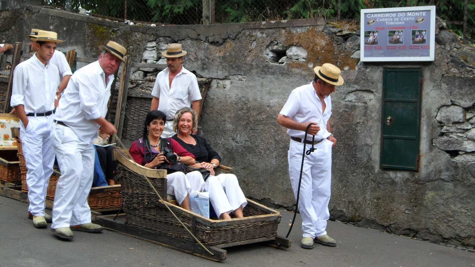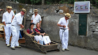 We then took a sledge ride on the toboggans driven by dressed in white "carreiros", whose name is fully justified by their ability to push us along those twisted, narrow alleys alternatively using their pushing or pulling strenghth prior or approachign the curves respectively.