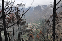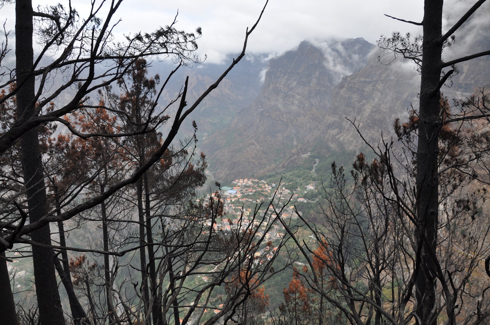 Curral das Freiras as seen from Eira do Serrado belvedere (Left). Fire burnt vestiges to be seen on the way to Eira do Serrado belvedere (Right).