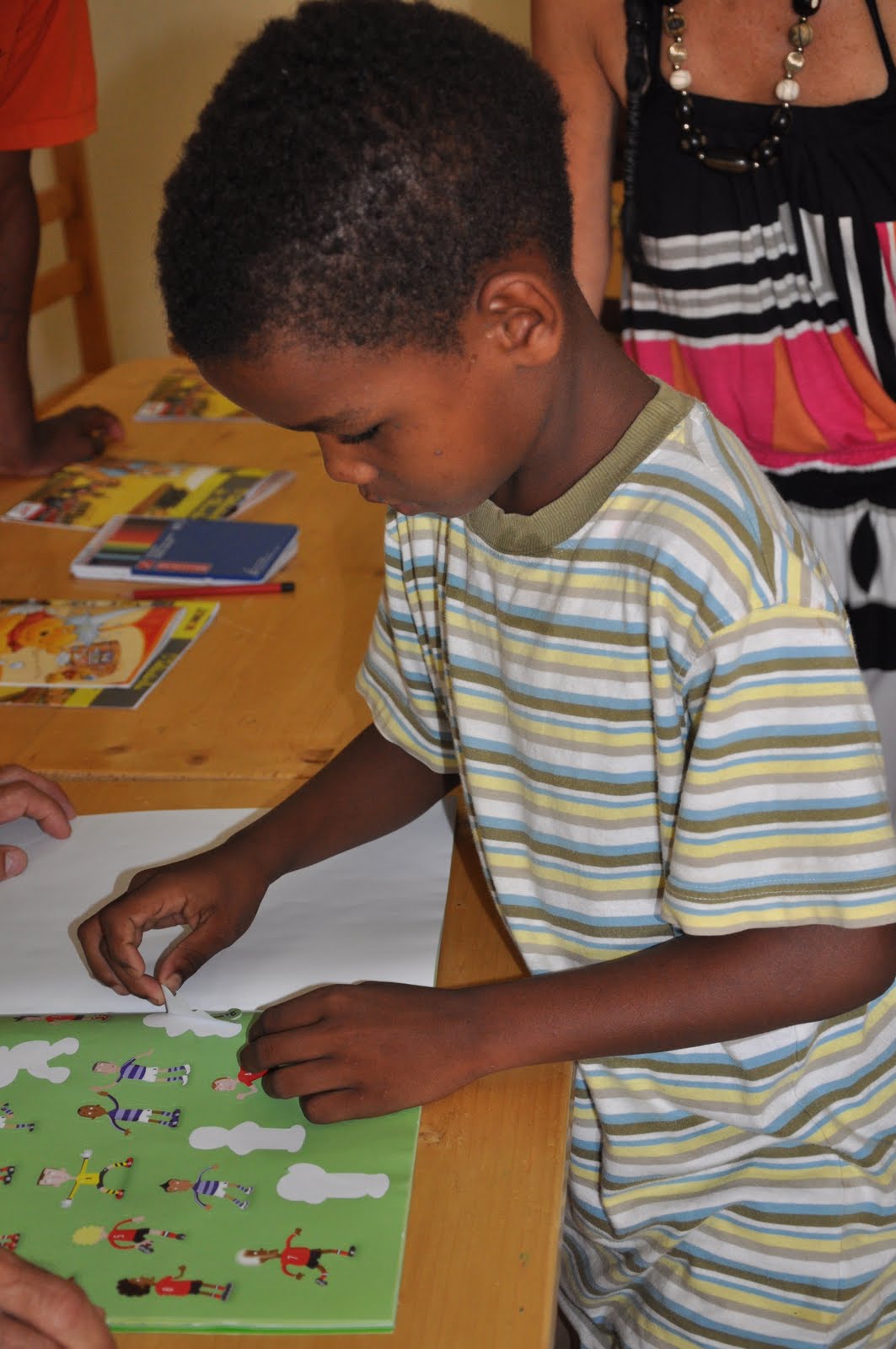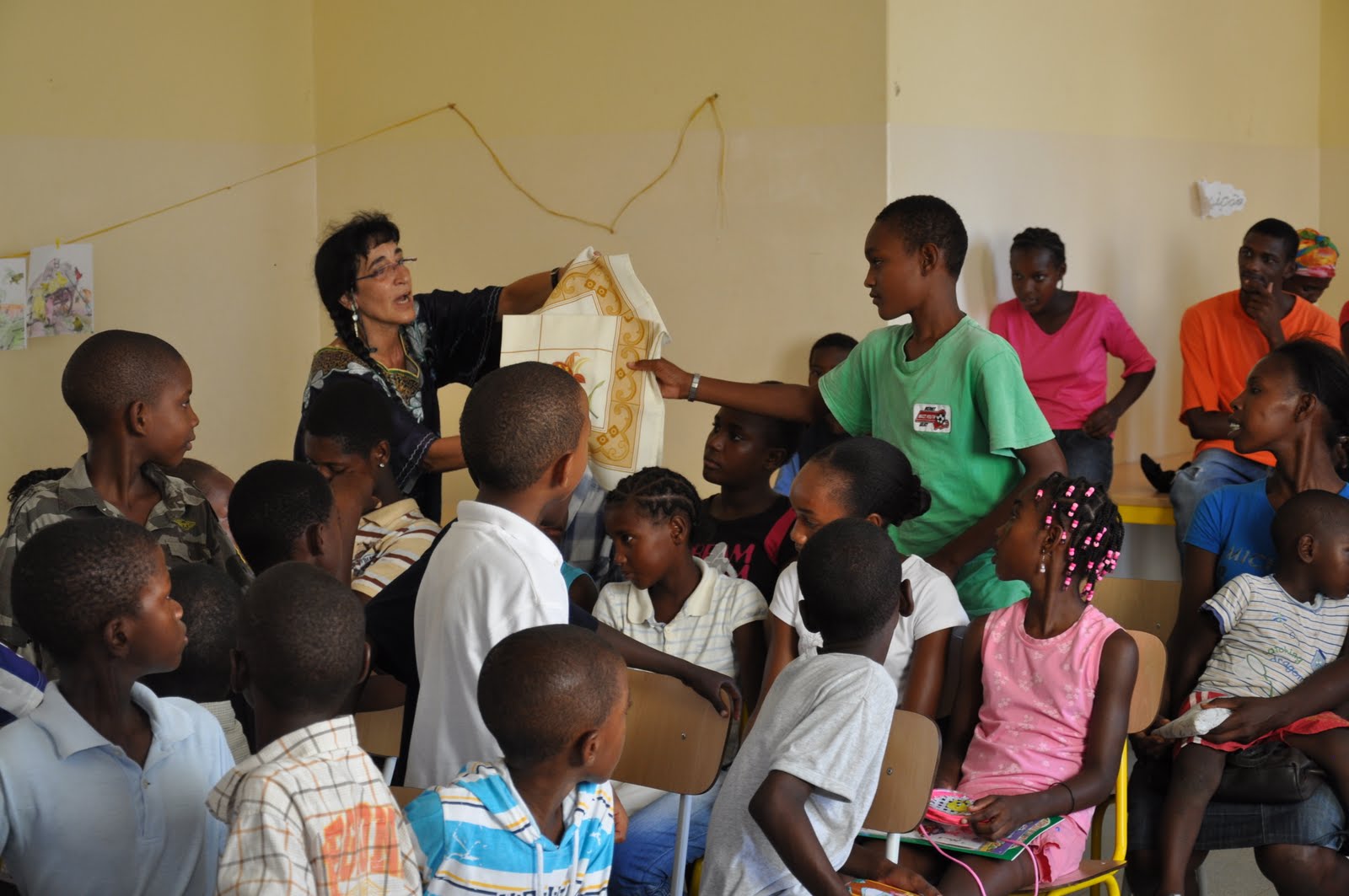 Some souvenirs (school bags, school cases, English books for beginners, small girl purses and stickers for the children attending the multi-disciplinary workshop in the morning, as well as some souvenirs for the parents (table cloths, embroidered round table cloths, needle and thread sets and hair pins).