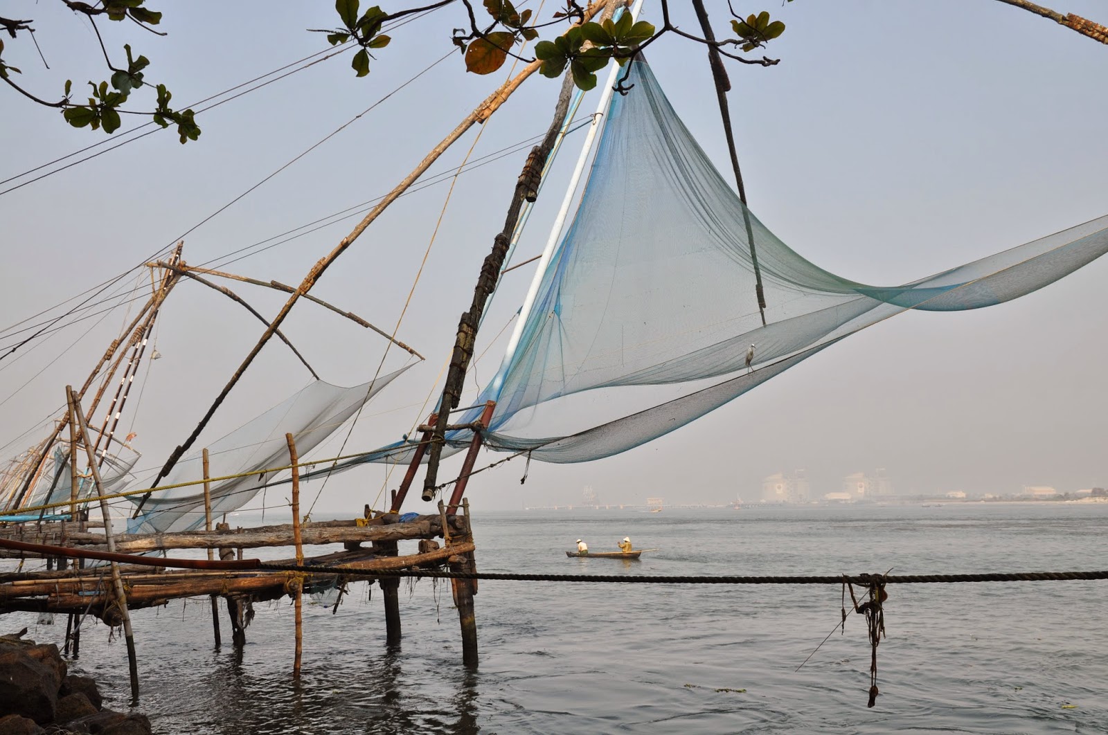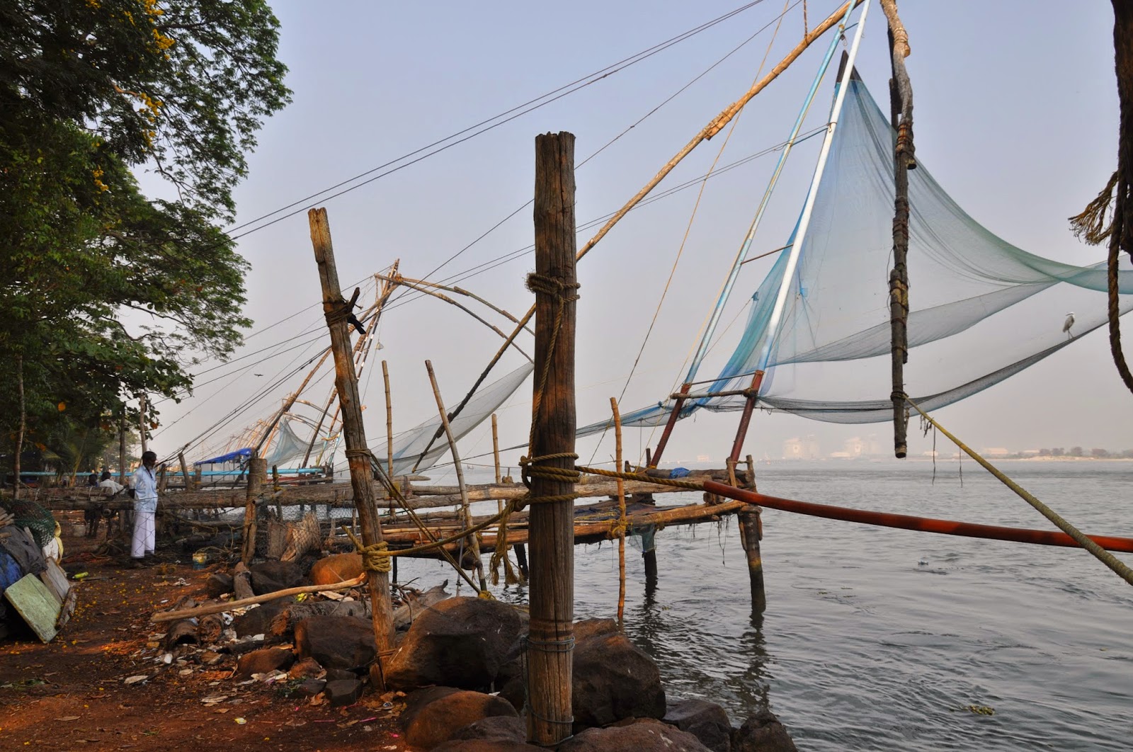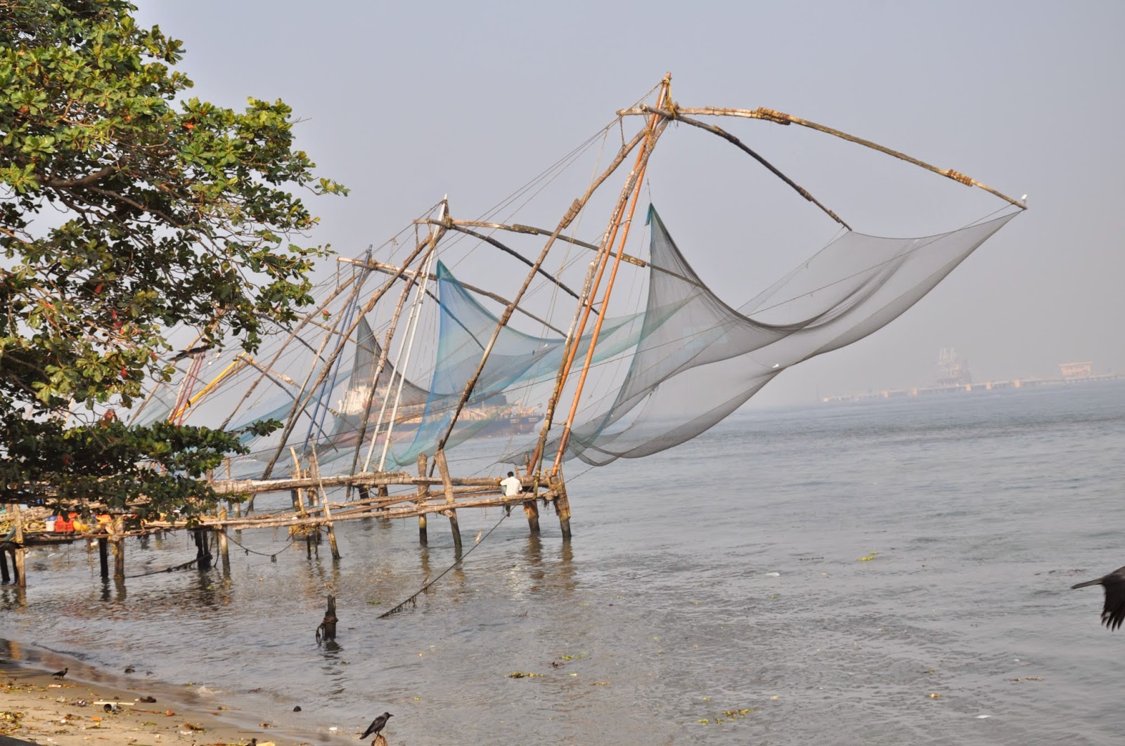 Known as Cheenavala fishing nets these are shore operated lift nets with huge mechanical contrivances holding out horizontal nets of 20 metres or more across. Each structure is at least 10 metres high and comprises a cantilever with large stones suspended from ropes as counter weights at the other end of the outstretched net. Each installation is said to be operated by a team of up to six fishermen.