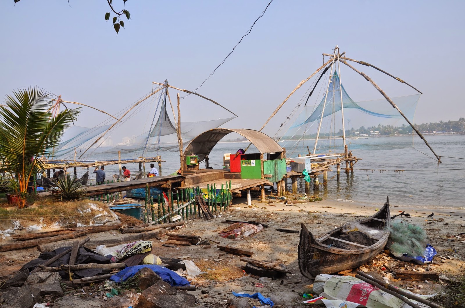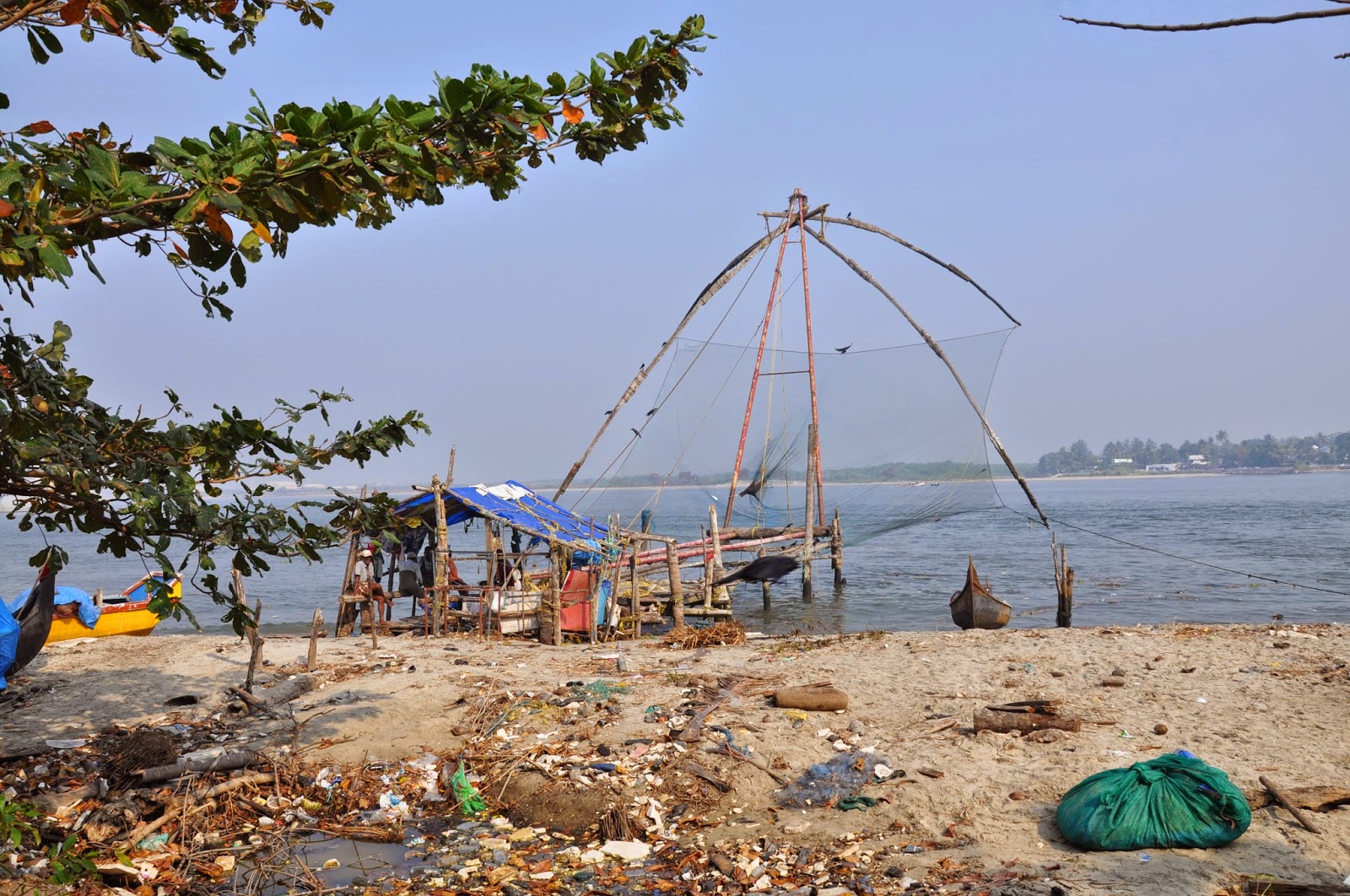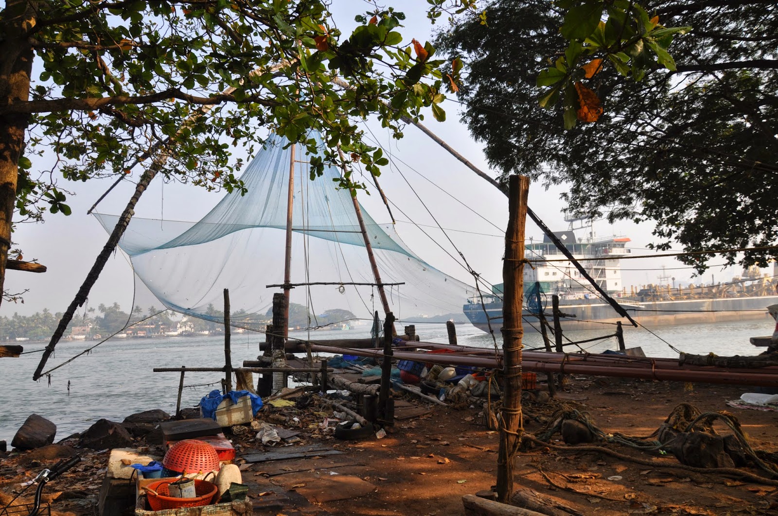 Known as Cheenavala fishing nets these are shore operated lift nets with huge mechanical contrivances holding out horizontal nets of 20 metres or more across. Each structure is at least 10 metres high and comprises a cantilever with large stones suspended from ropes as counter weights at the other end of the outstretched net. Each installation is said to be operated by a team of up to six fishermen.