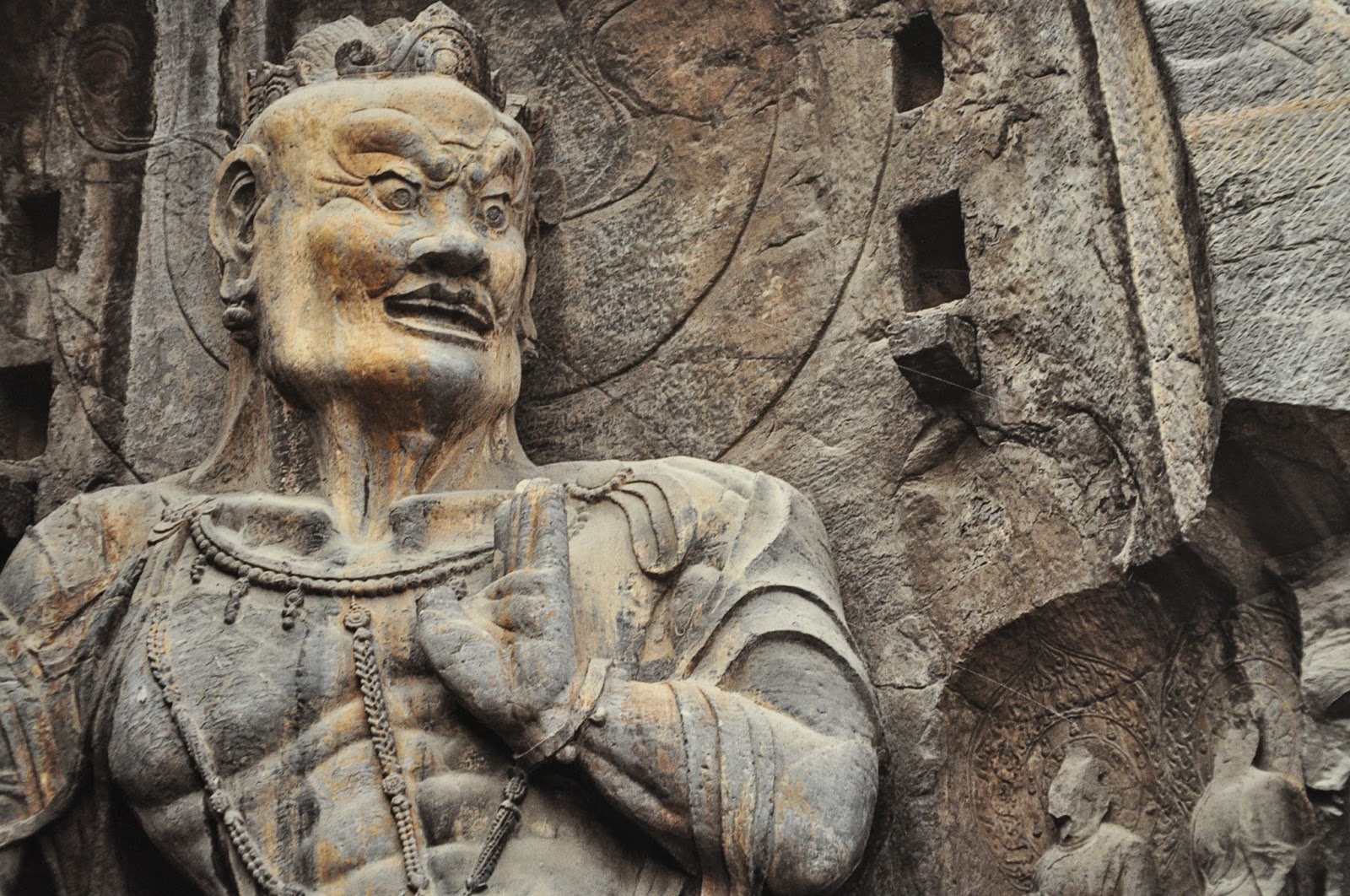 The Chinese Maijishan Caves (left) and a detail of the Longmen Caves (right) in Gansu and Hénan respectively.
