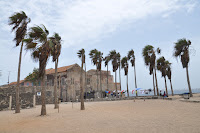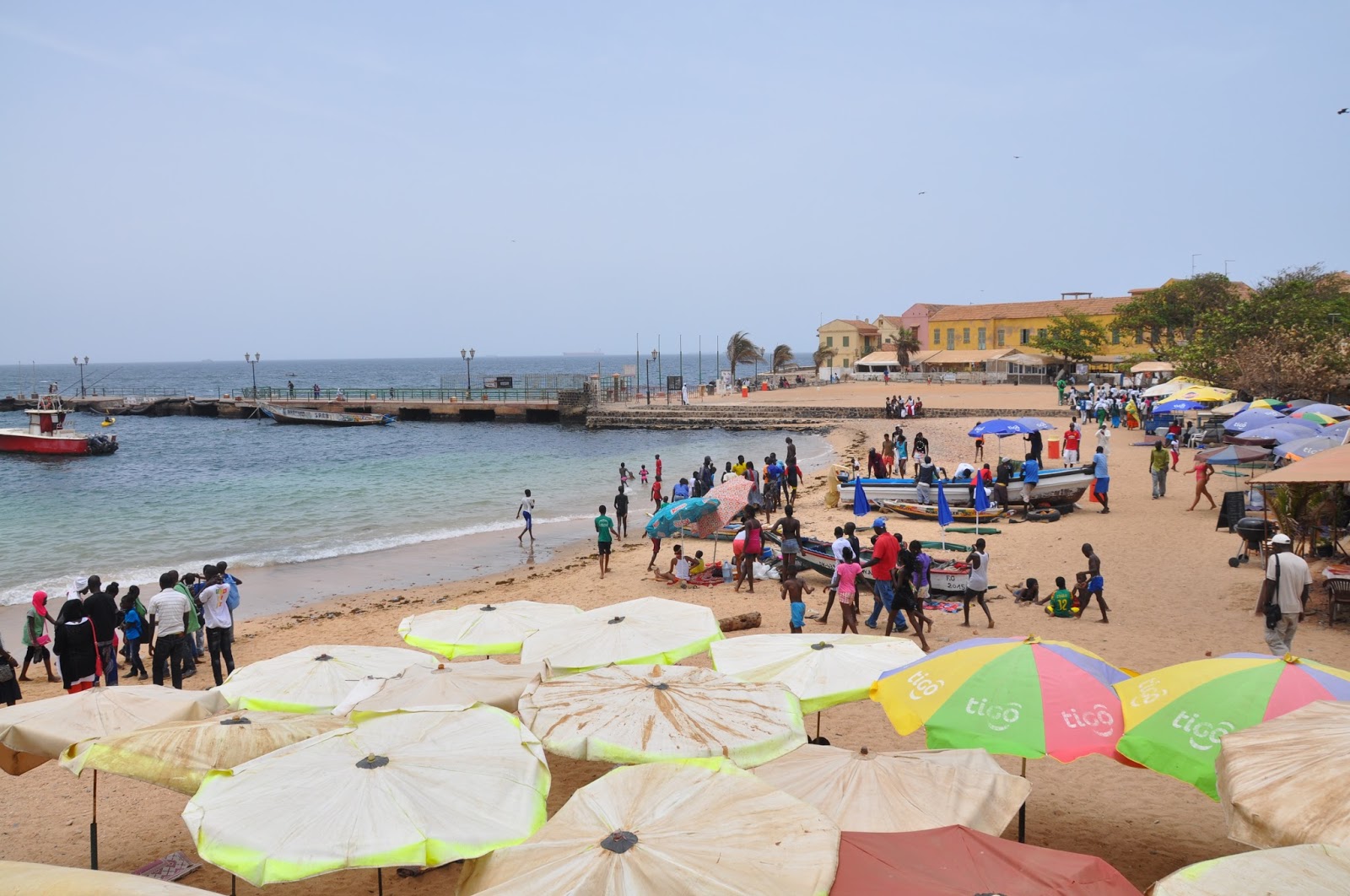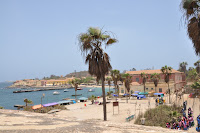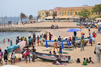 We walked along the shore on which several children were playing football and quite a few street vendors (whose merchandise one couldn't see as their little stalls like storage boxes were located behind the colonial buildings), were sitting around. I would later return to see one of them Khadi, who had promised to show me some African waxed tissues. Most people were on the little fishing beach close by as I had the impression some fishing boats had just made their way ashore.