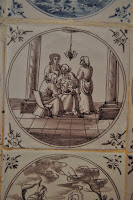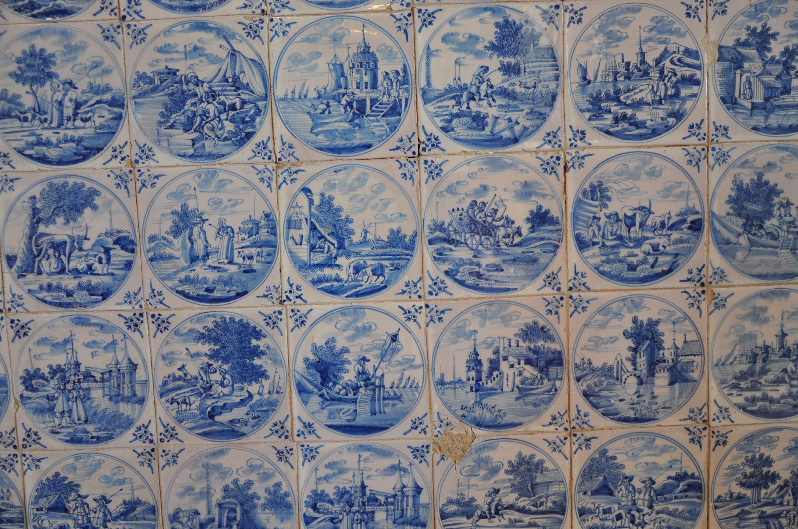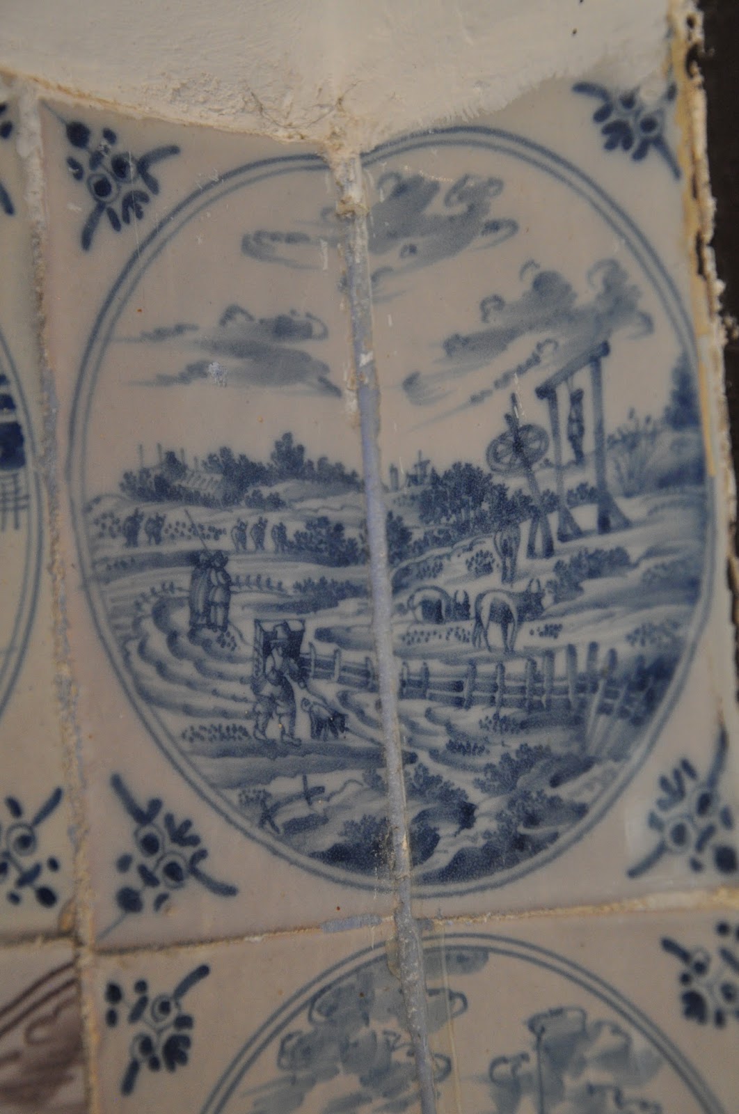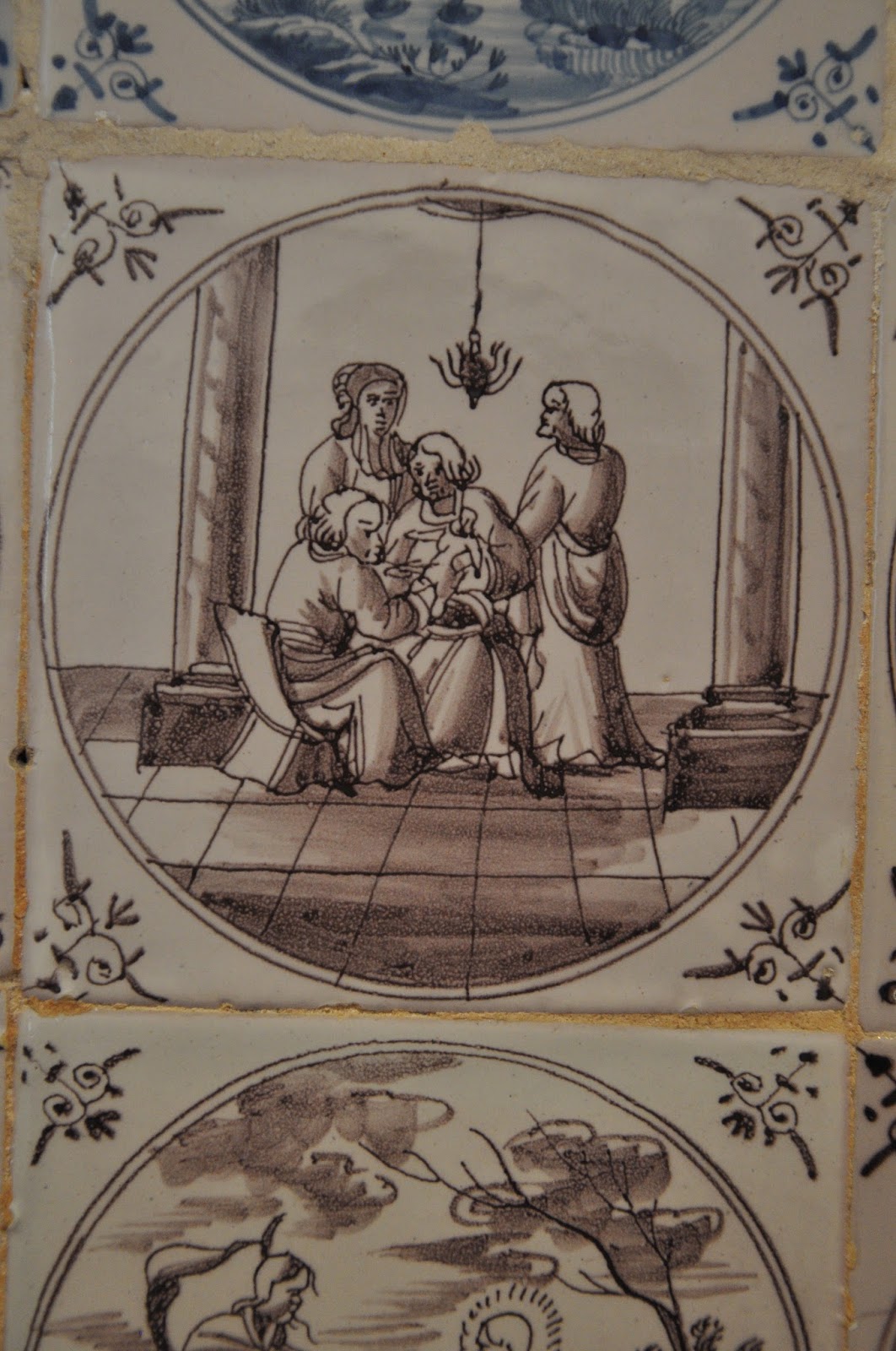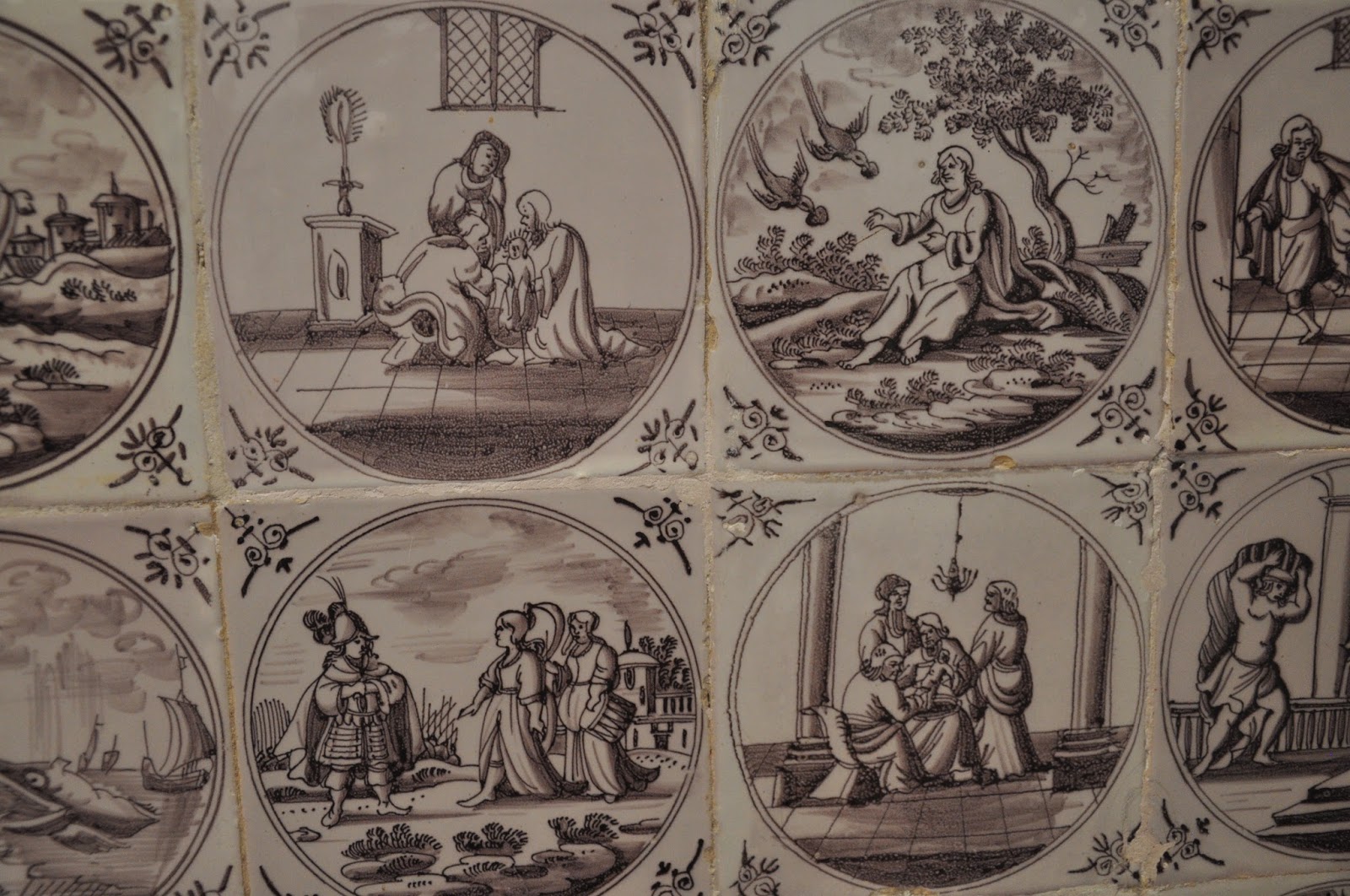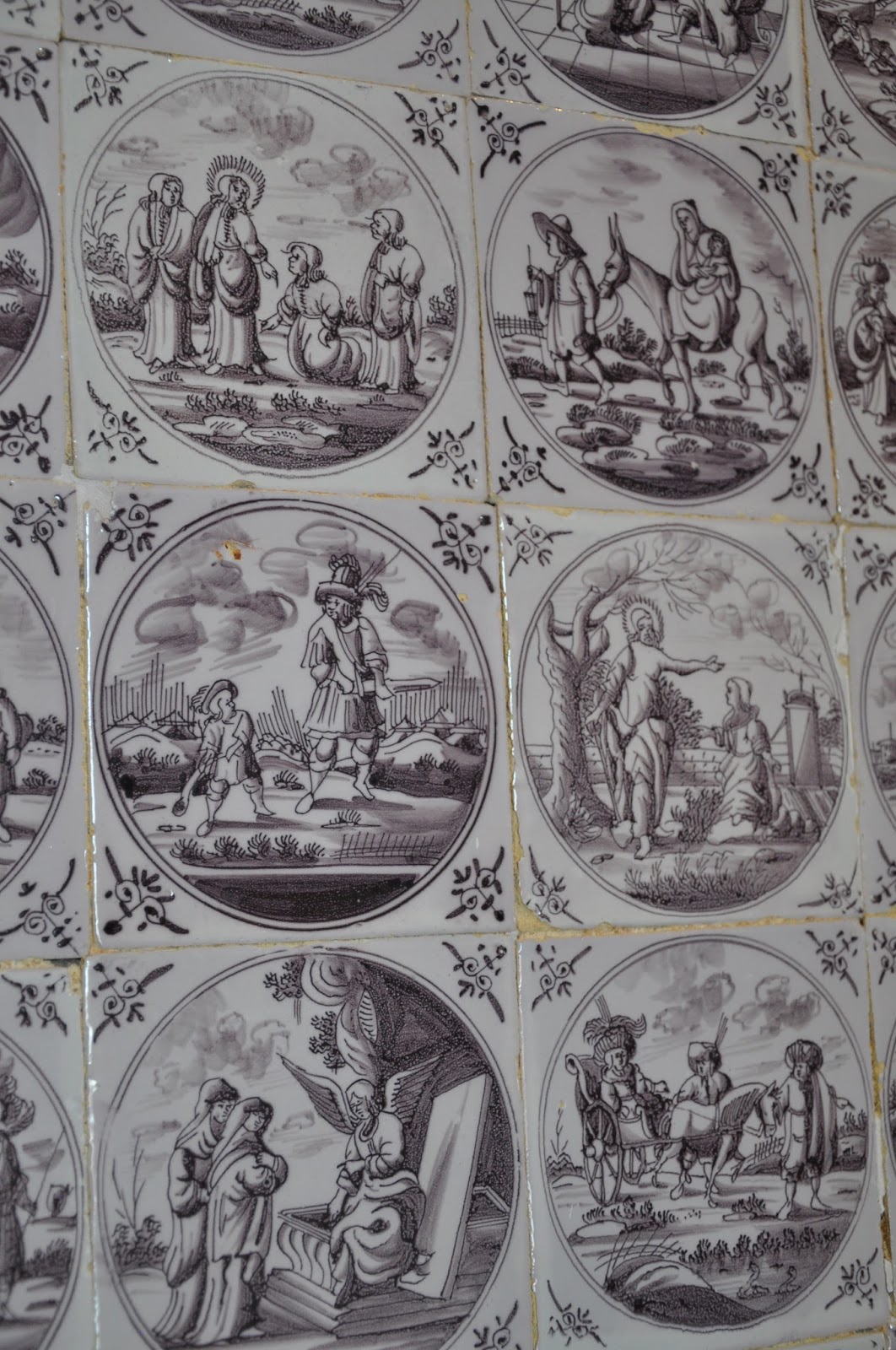 The Biblical glazed tiles painted with manganese oxide covering the centre part of the walls, whose edges are covered by cobalt blue tiles of landscapes, were quite interesting in as much as their 63 scenes were divided in those pertaining to the Old Testament with 36 of the New Testament, all of which are represented within a double circle with an ossenkop in every corner.