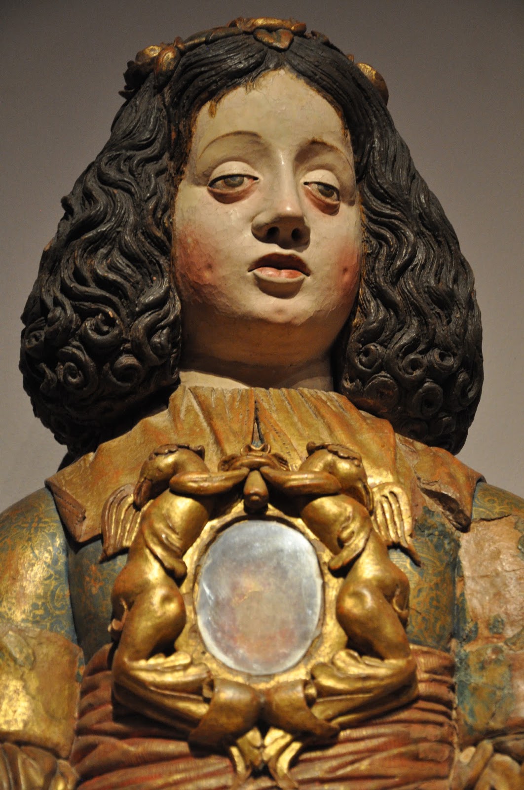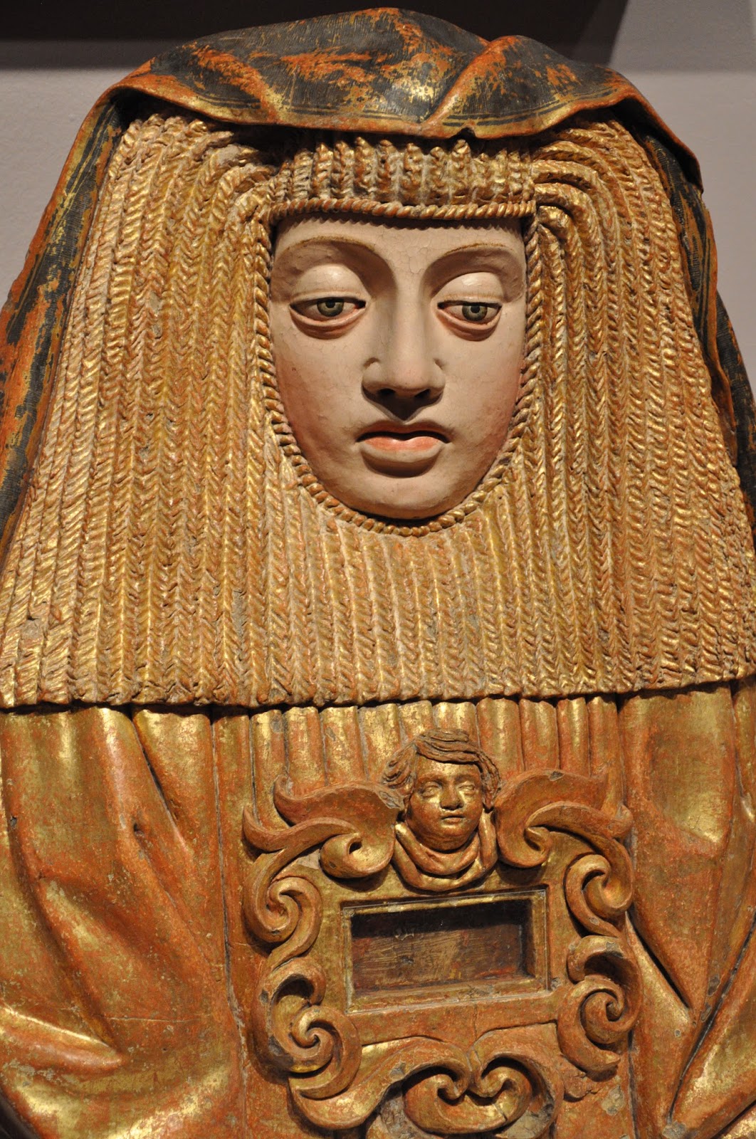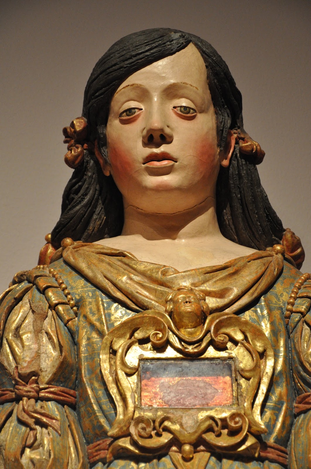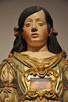 A series of gilded and polychromed terracota reliquary busts of the Virgin Mary, St. Sebastian and a holy nun did invariably catch the viewers' attention and set the epoch. According to provided information they all came from the Monastery of Alcobaça.