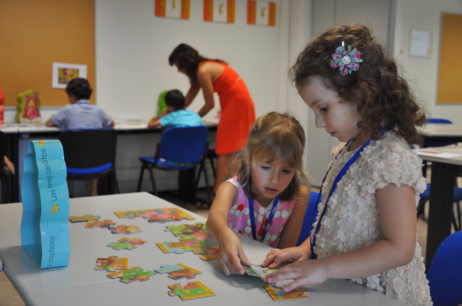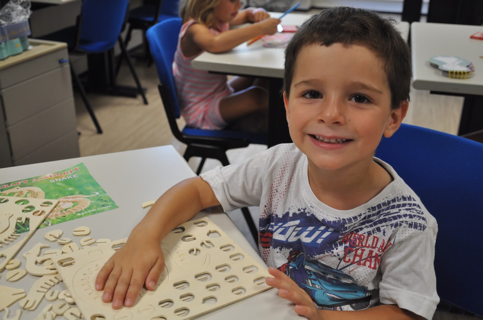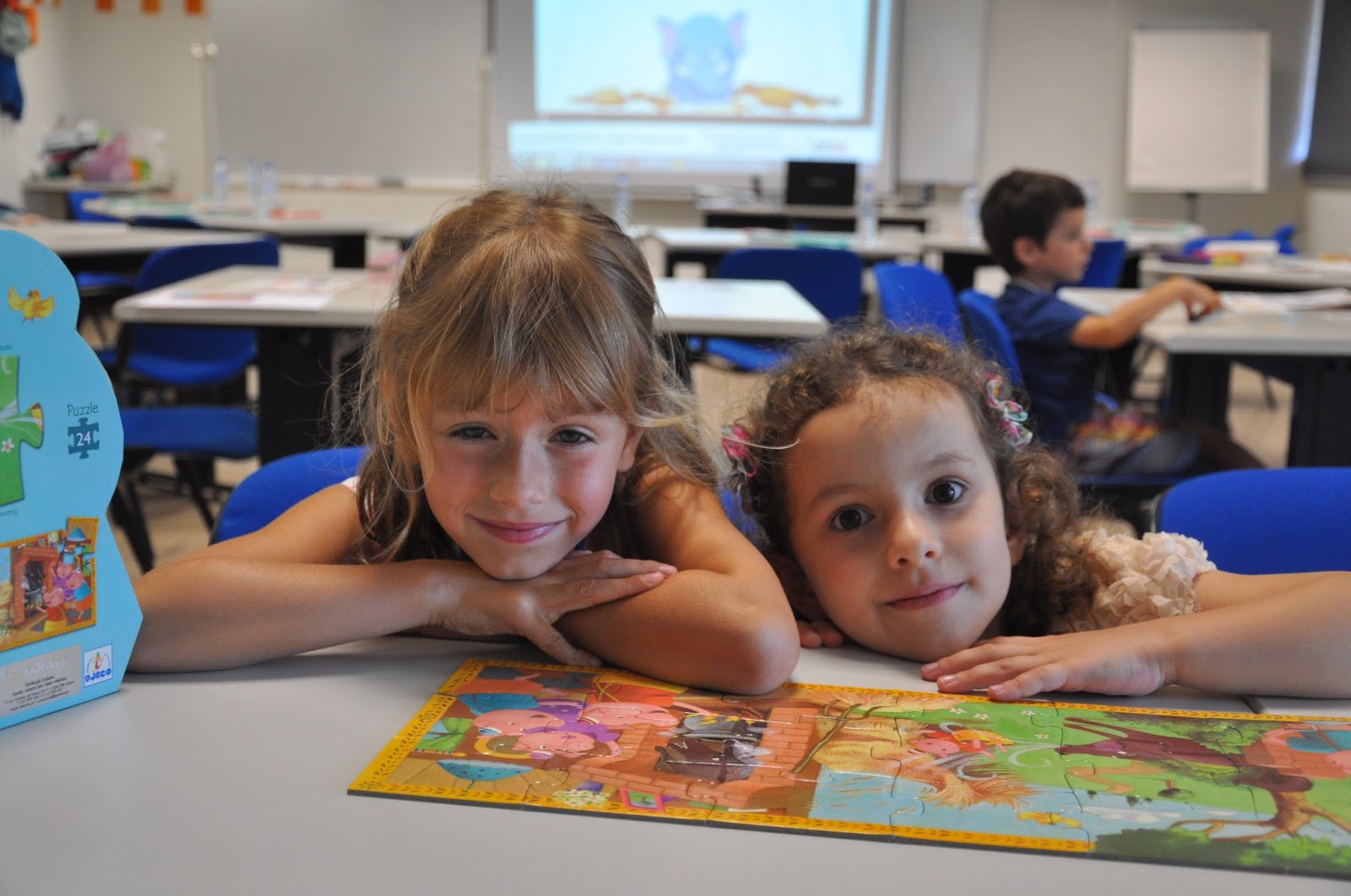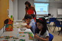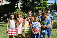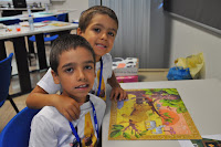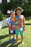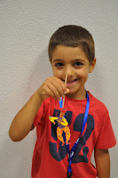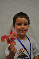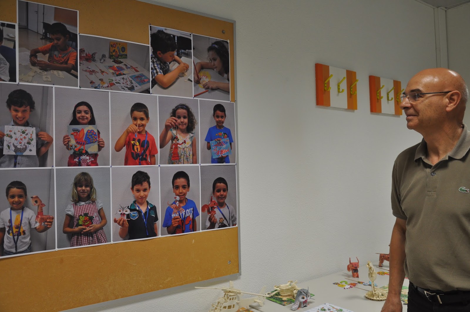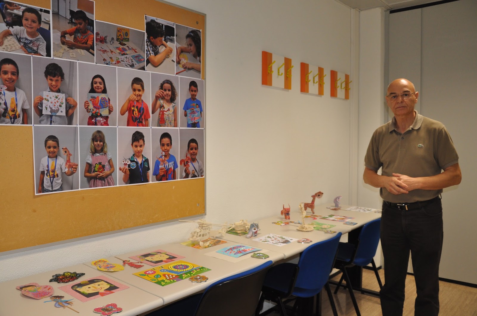 The Head of the Training Centre, who would not be in the following day to hand out the certificates despite being a fervent admirer of this type of activities (whose grandchildren have been attending), was exceptionally allowed into the classroom (Ana and I decorated with the children's photos, as well as their artisitic pieces) where the artistic exhibition would be held.