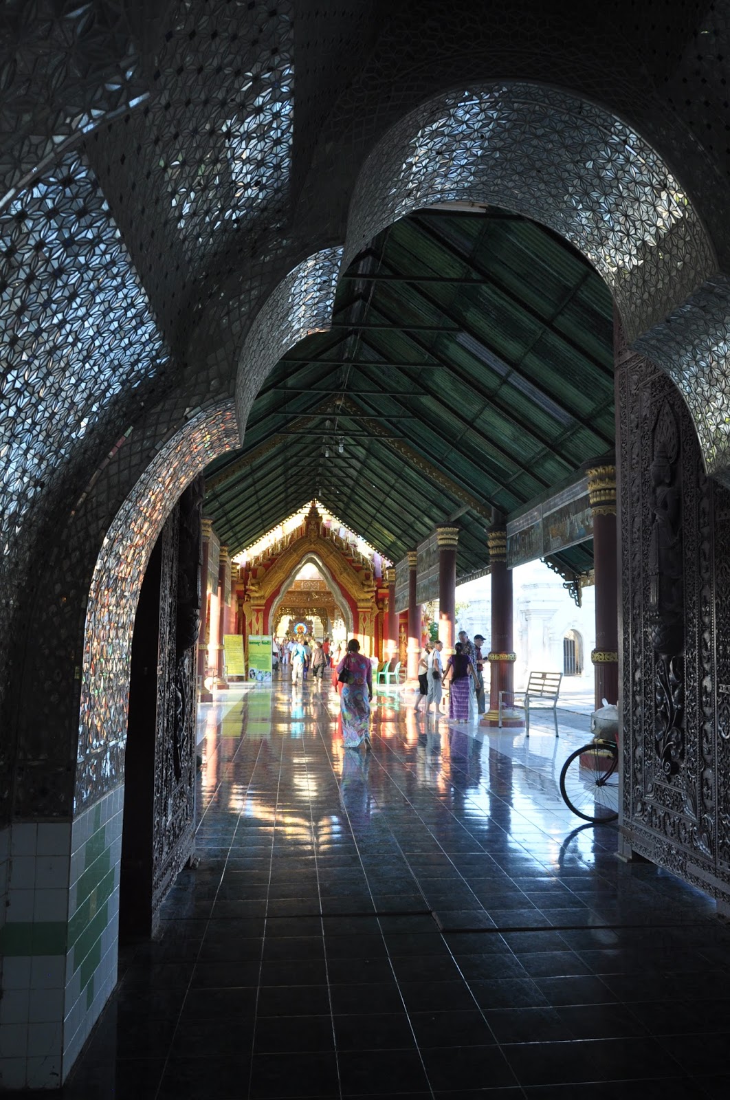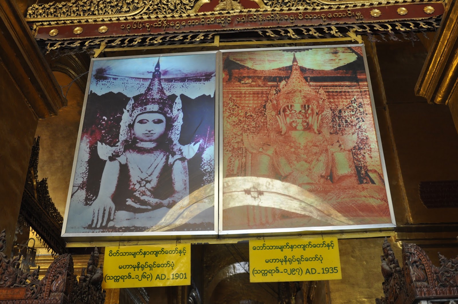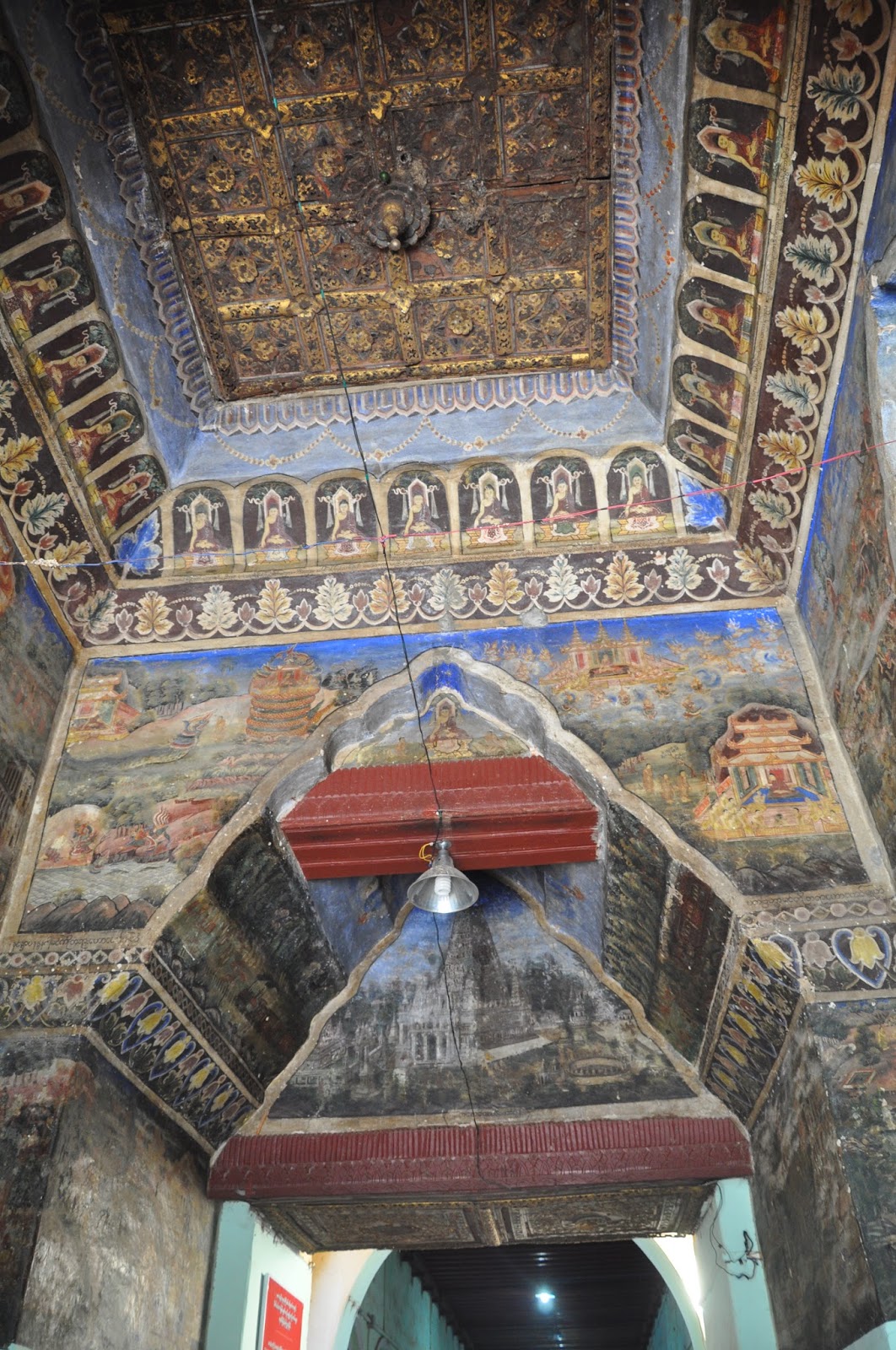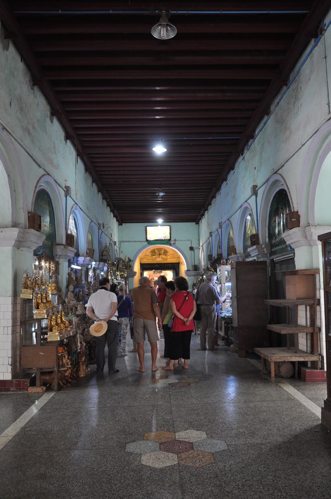 We walked into the most revered Buddhist shrine in Mandalay, the Mahamuni Pagoda (second to the Shwedagon). We had to walk along a corridor profusely decorated with frescoes, some of which were faded away and lined up with handicraft shops.