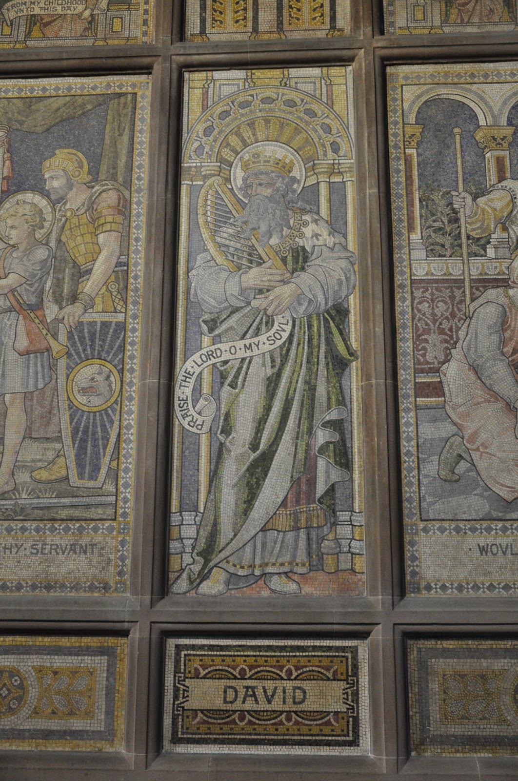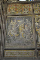 Once we set foot in its interior I was immediately drawn to some mosaic covered walls, which I tried to photograph despite the gloomy-like atmosphere. I was soon attracted by the wooden quadripartite vault of the choir, which I didn't manage to photograph, as well as the high altar with its reredos and the tile floor of the nave.
