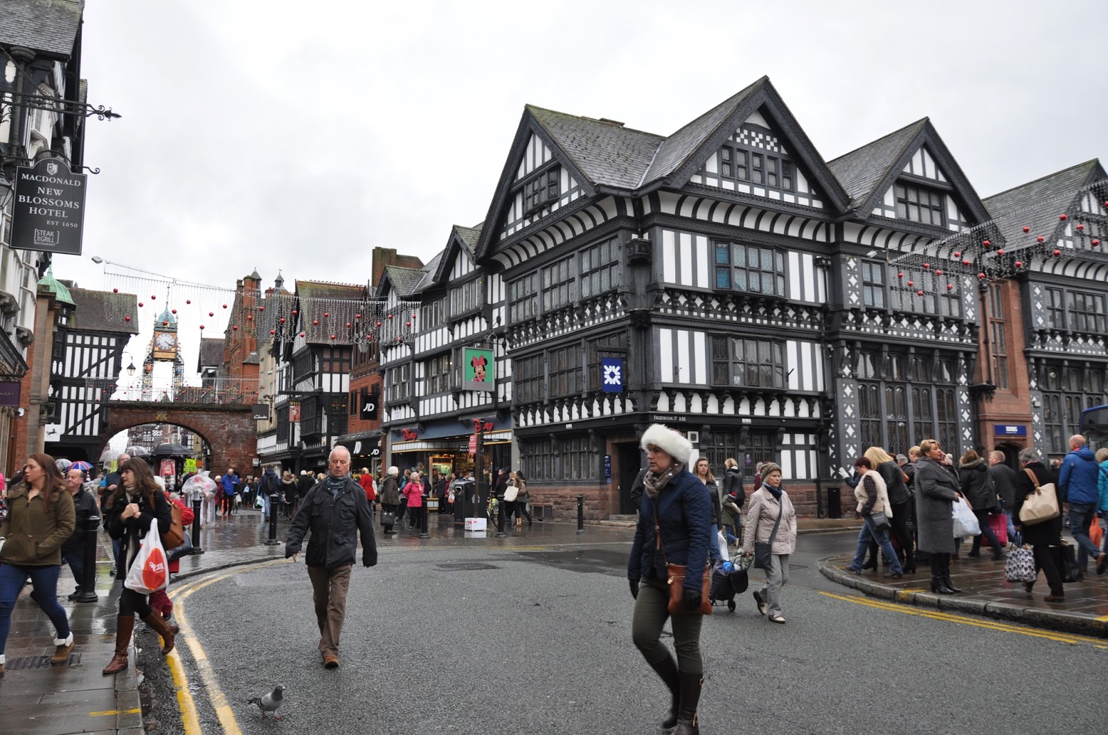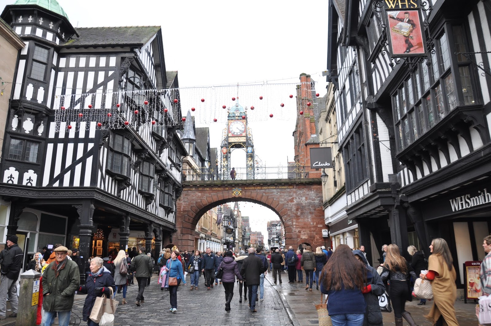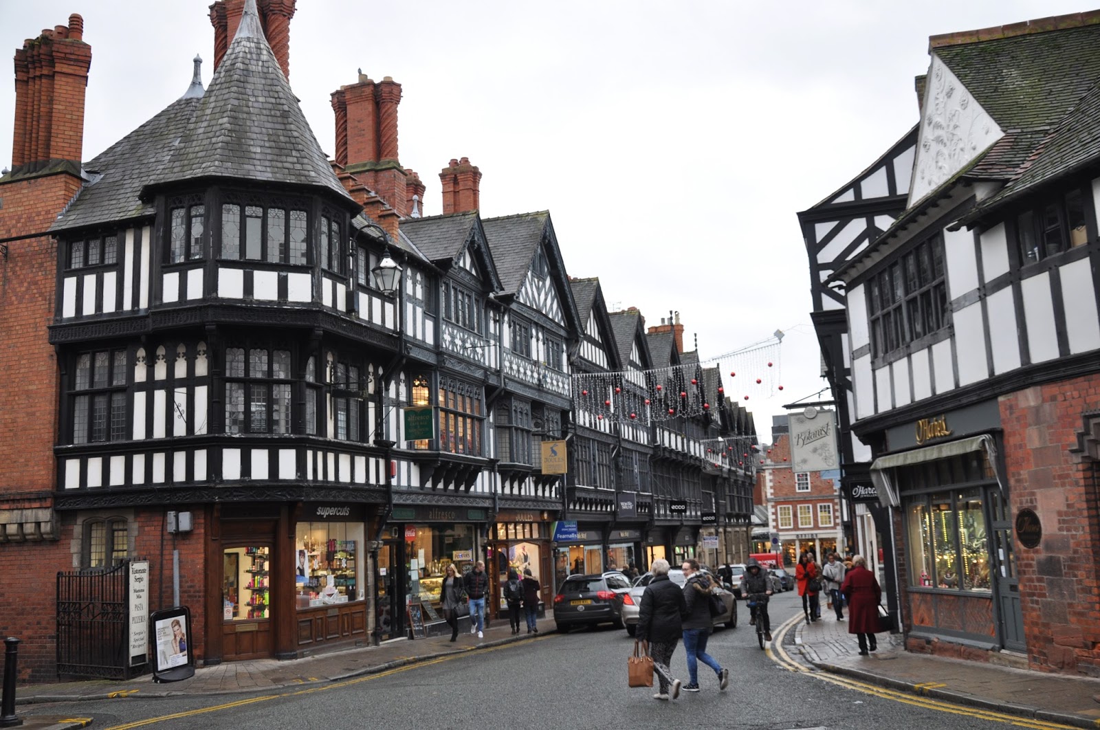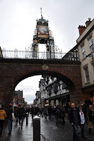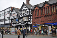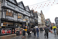 We managed to get the nine o'clock train, having reached Chester approximately one hour later. It was raining as well but that didn't prevent us from walking along the rows of brick houses followed by the typical Chester black-and-white "double decker" shopping streets as we headed towards the city's Cathedral. The streets were crowded with people clearly carrying out their Christmas' shopping.
