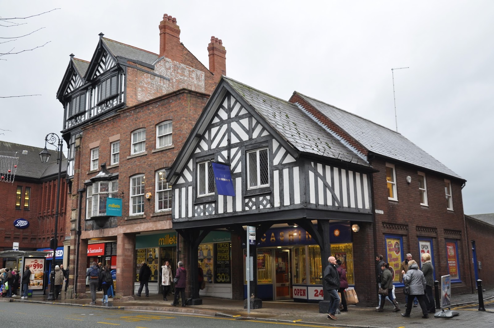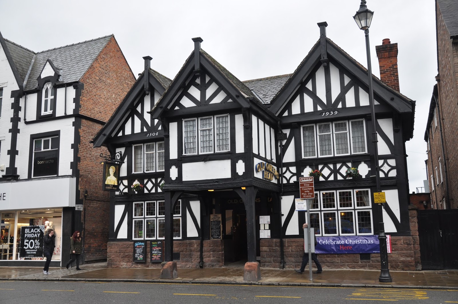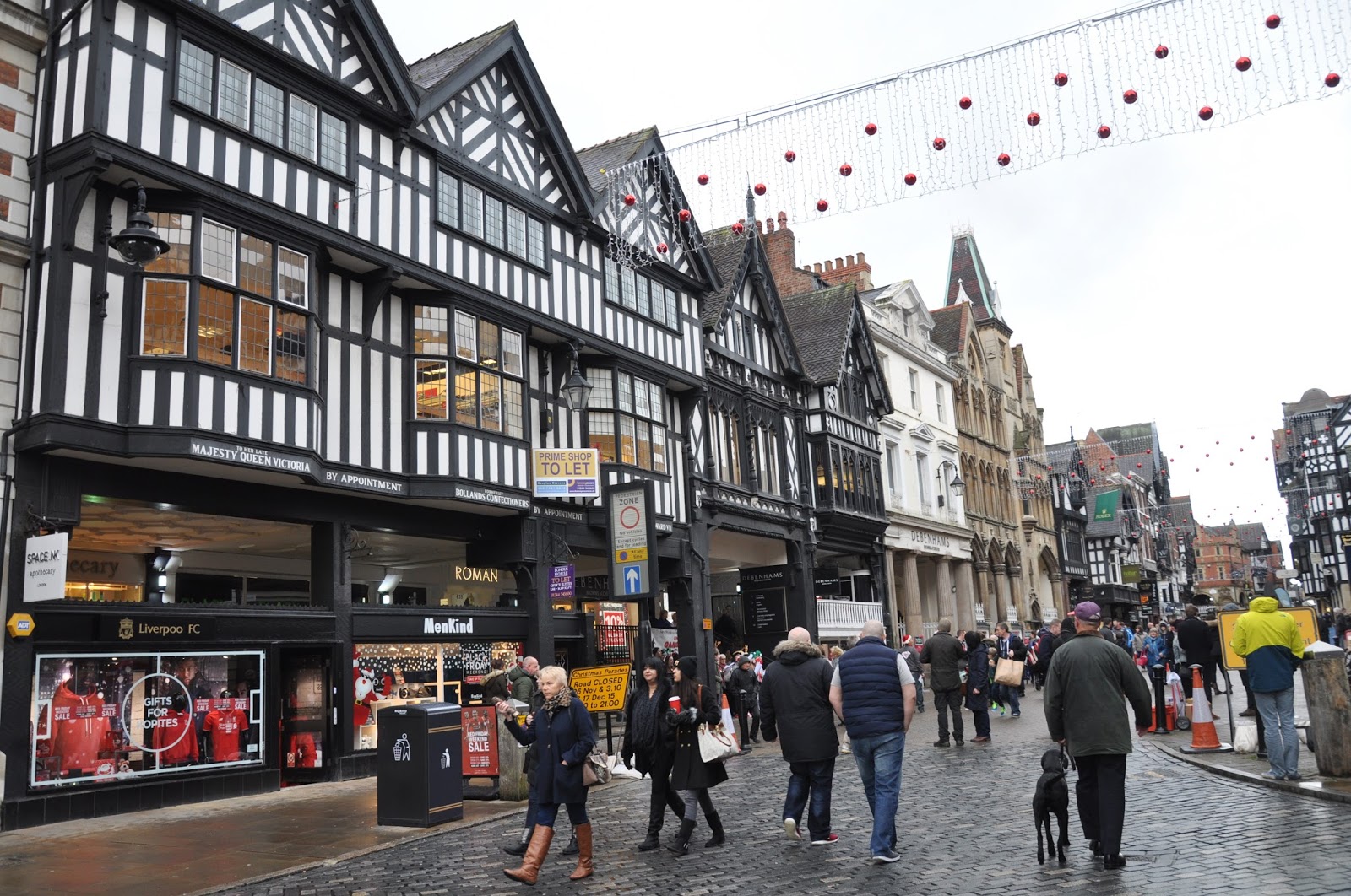 We managed to get the nine o'clock train, having reached Chester approximately one hour later. It was raining as well but that didn't prevent us from walking along the rows of brick houses followed by the typical Chester black-and-white "double decker" shopping streets as we headed towards the city's Cathedral. The streets were crowded with people clearly carrying out their Christmas' shopping.