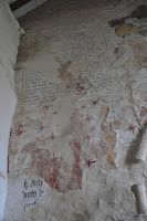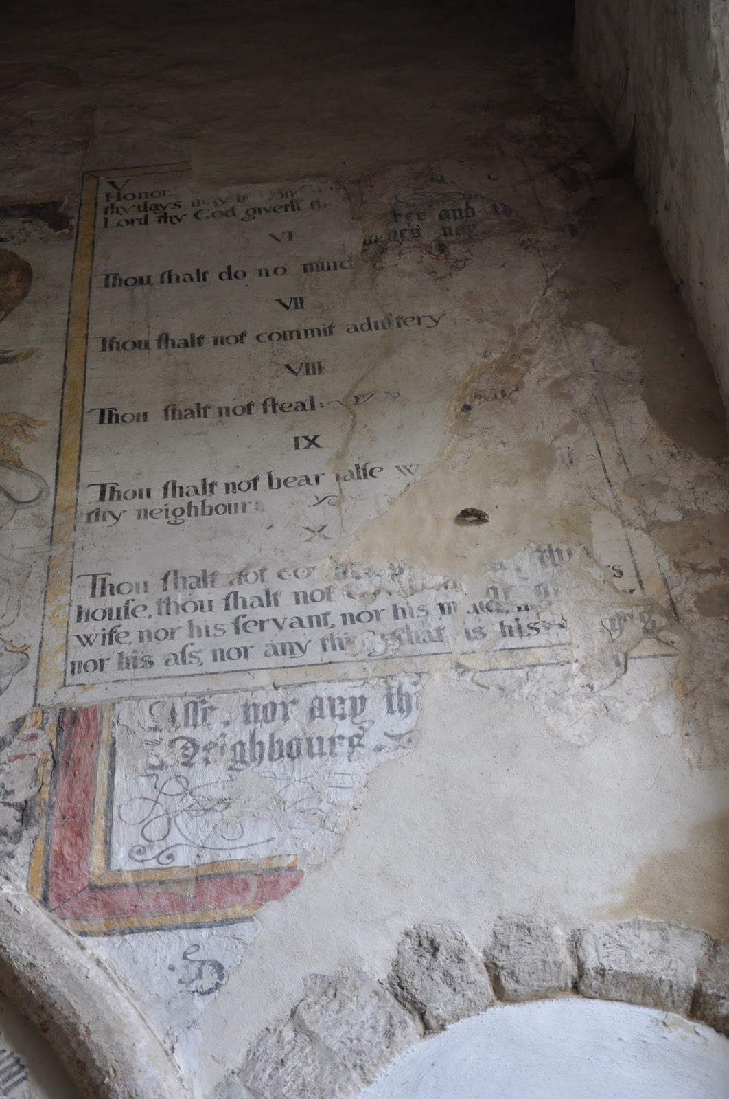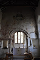 Its walls are covered with fragmented frescoes- 12th century figured ones in the chancel, black letter inscriptions of the 16th and 17th centuries and a bond memorial inscription of about 1800.